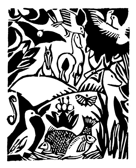 André Derain (1880-1954) was born just outside Paris, and is primarily known as a painter. Derain was close with Matisse, and together they were a part of the Fauvist movement, known for its bold use of colour and heavy brush-strokes. Derain’s woodcuts—published as book-illustrations and in underground arts and poetry magazines magazines—though having a far more minimal pallet, exhibit a similar boldness in figuration and “heavy” line-work.